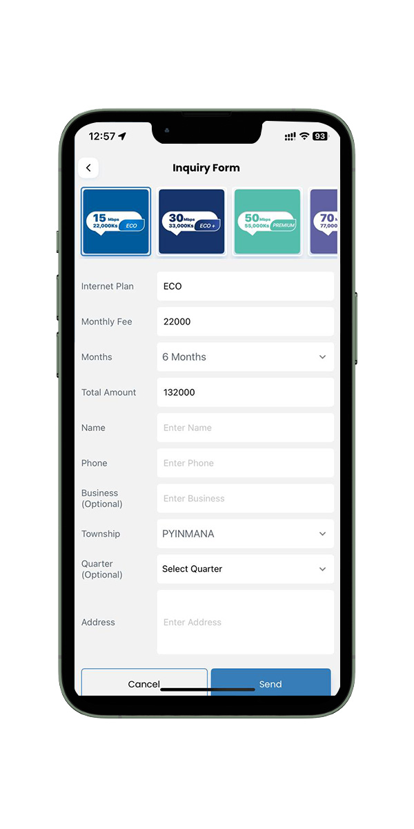 နှစ်သက်ရာ Internet Plan ကို ရွေးပြီးအမည်၊ ဖုန်းနံပါတ်၊ မြို့နယ်၊ ရပ်ကွက် ၊ နေရပ်လိပ်စာတို့ကိုဖြည့်ပြီး Submit ကို နှိပ်ပါ။